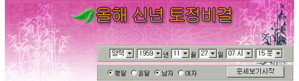 토정비결은 한 해의 운수를 알아보는 대표적인 운수풀이 방법으로, 운세 산출 공식에 충실하게 현대적으로 프로그램하여 정확한 괘를 얻을 수 있도록 하였으며 괘의 풀이 또한 현대인들이 알기 쉽도록 풀이 하였습니다.